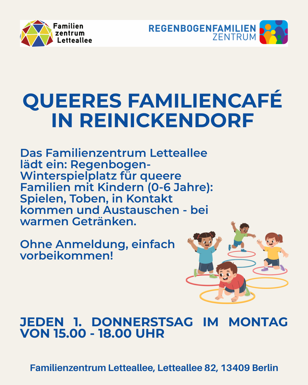 Queeres Familiencafé in Reinickendorf  Das Familienzentrum Letteallee lädt ein: Regenbogen-Winterspielplatz für queere Familien mit Kindern (0-6 Jahre): Spielen, Toben, in Kontakt kommen und Austauschen - bei warmen Getränken. Ohne Anmeldung, […]